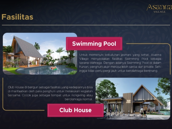 Di tengah perumahan, terdapat clubhouse yang menjadi pusat aktivitas komunitas, lengkap dengan fasilitas rekreasi seperti kolam renang dan taman bermain anak. Dengan area hijau yang luas dan penataan lingkungan yang rapi, Asanna Village memberikan suasana asri yang nyaman untuk bersantai dan beraktivitas di sekitar rumah.