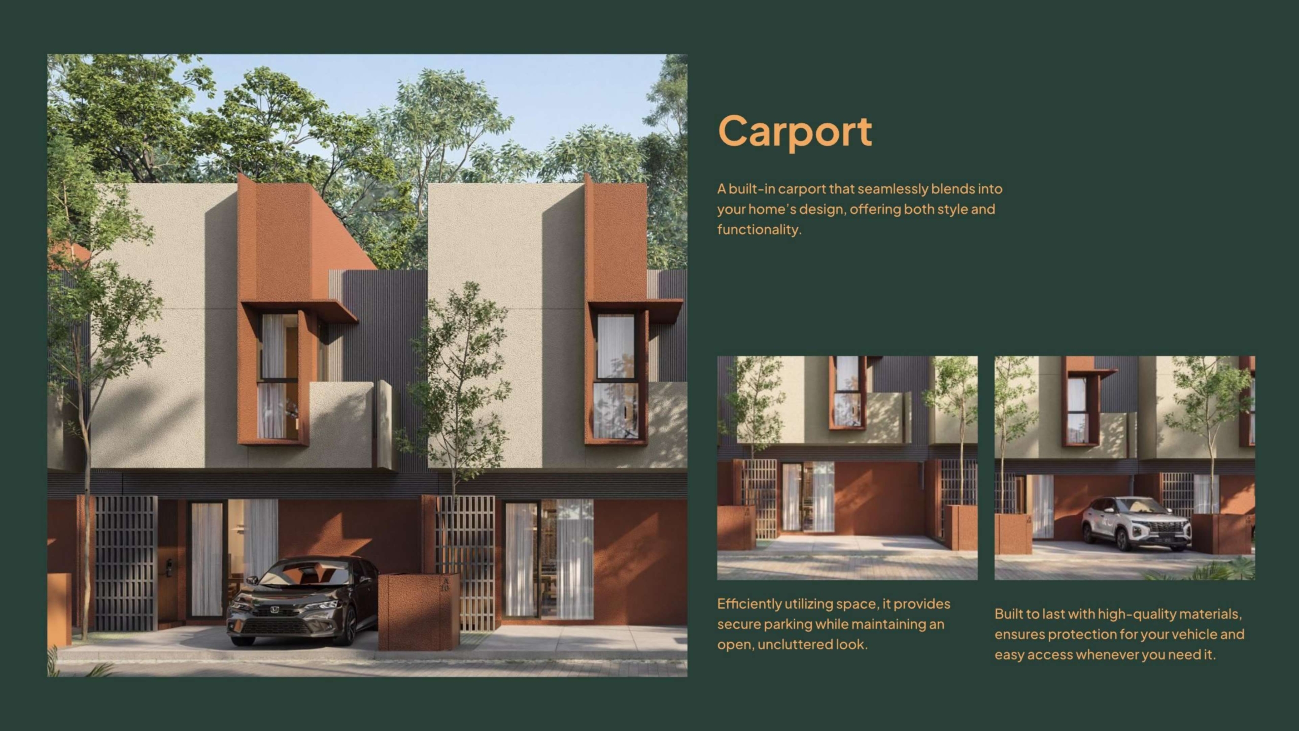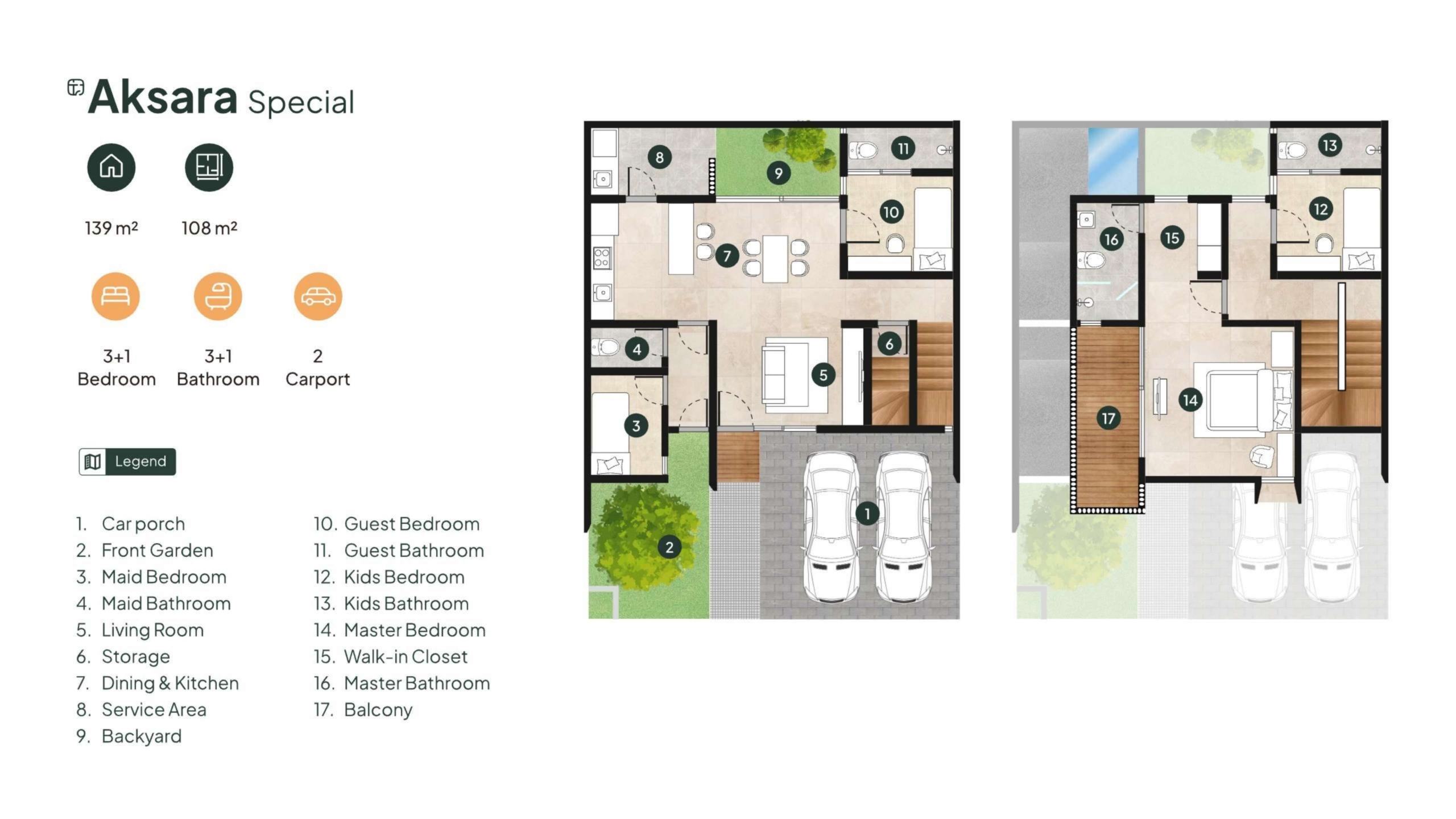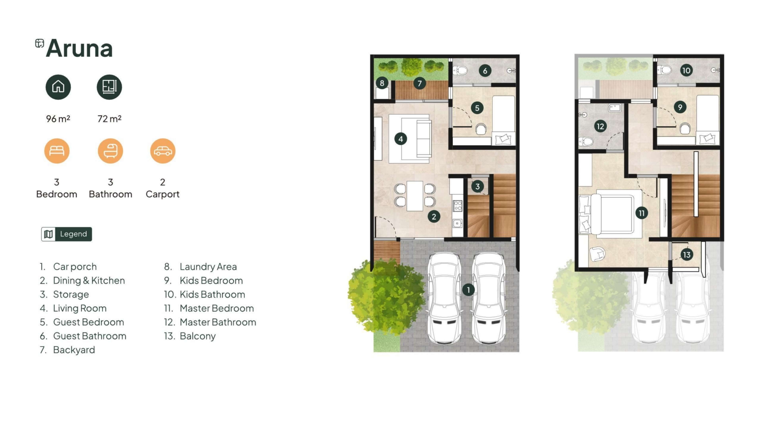 Fasilitas Ruang: Carport, Living Room, Dining & Kitchen, Storage, Guest Bedroom & Bathroom, Kids Bedroom & Bathroom, Master Bedroom + Master Bathroom, Laundry Area, Backyard, Balcony.