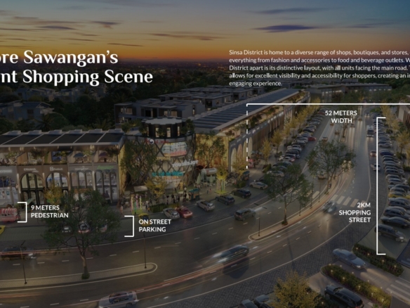 Berada di sepanjang Jalan Senopati Boulevard dengan lebar jalan mencapai 52 meter, Sinsa District menawarkan lokasi yang strategis dan visibilitas tinggi bagi para pelaku usaha. Kawasan ini diharapkan menjadi ikon baru yang mengubah wajah Sawangan menjadi pusat komersial yang modern dan nyaman.
